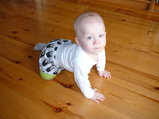 Viggo har som sagt börjat åla sig fram i sjuk fart. Jag har förstått att jag måste börja jobba lite med min bacillskräck eftersom han har en förkärlek för allt som är smutsigt och nu kan jag inte längre lägga honom på behörigt avstånd från allt eftersom han på 2 sekunder ratar lekhörnan med alla leksaker som jag tycker är Viggo-vänliga (typ gosedjur). Att slicka på dammsugaren är till exempel en av favoritsysselsättningarna. I vilket fall så får han ju inte till själva krypet eftersom han halkar på knäna. Världens bästa mormor har därför inköpt knähalkskydd till honom och de funkar faktiskt ganska bra!